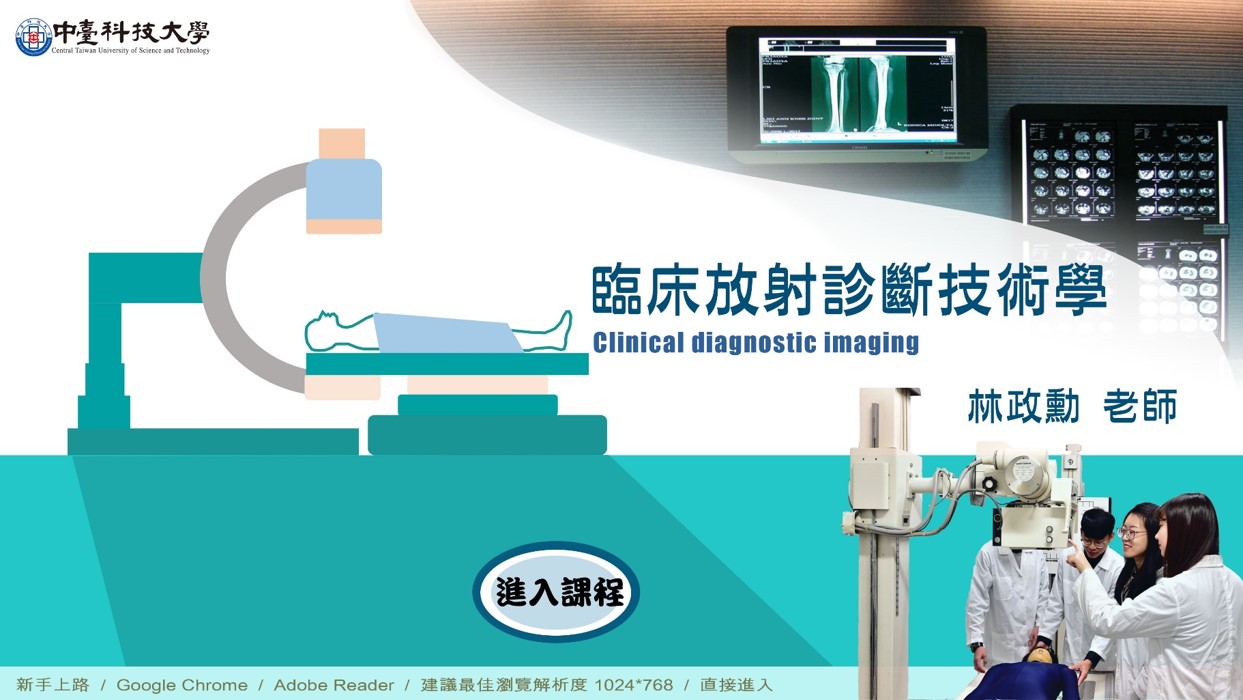 課程名稱:臨床放射診斷技術學 學分數及修別: 2 學分/選修 修課週數:18週 課程說明: (一)、 本課程屬於專業選修,於二技部三年級下學期開課,適合已具先備知識程 度的學生選修。 (二)、 採用翻轉教學( flipped classroom)鼓勵學生自我預習,並於面授課堂中共同解決問題。