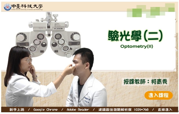 課程名稱:驗光學(二) 學分數及修別: 2 學分/必修 修課週數:18週 課程說明:本課程的主軸是要介紹更進階的驗光學概念。課程中包含了中心與周邊視野檢查、瞳孔照射光線後其視覺傳導路徑檢測、斜視斜位量的檢測、認識綜合驗光儀設備以及完整的自覺式流程及眼睛調節能力之觀念。